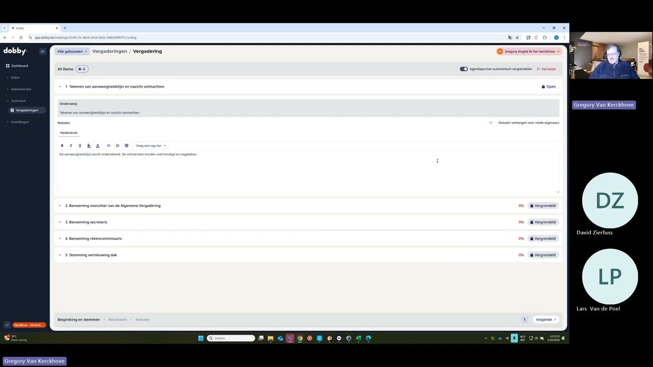 De dag van de vergadering nadert, jij bent aan zet. dobby start de bijeenkomst automatisch en bezorgt alle genodigden een extra notificatie om deel te nemen. Dat betekent dat wie dobby gebruikt, niet fysiek bij jou hoeft te passeren alvorens je begint. Al jouw voorbereidend werk wordt netjes gebundeld en digitaal gedeeld met de mede-eigenaars tijdens de vergadering. Zowel jij als zij kunnen het verloop eenvoudig volgen dankzij de voortgangsbalk onderaan in dobby. Jij hebt alles in handen voor een succesvolle algemene vergadering!